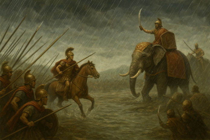 The Battle of the Hydaspes (326 BCE) was the last great confrontation of Alexander the Great’s Asian campaign. Fought on the banks of the Jhelum (ancient Hydaspes) in present-day Pakistan, it pitted Alexander’s disciplined Macedonian army against the powerful forces of King Porus, ruler of the region between the Jhelum and Chenab rivers. The battle not only tested Alexander’s tactical brilliance but also highlighted the resilience and valor of Porus, whose defiance earned him the conqueror’s respect.