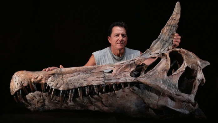 Measuring around 40 feet (about 10-14 meters) long -roughly the size of a school bus-this semi-aquatic predator lived approximately 95 million years ago during the Late Cretaceous period. The fossils include a remarkably complete skull, jaw fragments, teeth, and crest elements, reconstructed digitally even in the field using solar-powered laptops amid the desert camp.