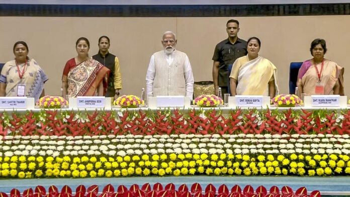 Gathering at the ‘Nari Shakti Vandan Sammelan’ at Vigyan Bhawan, in New Delhi on April 13, 2026. PM addressing on the occasion.