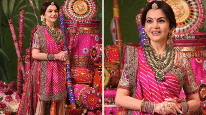 Nita Ambani embraced the festive spirit with a Banarasi lehenga skirt featuring a patchwork of fabrics, intricate zari work, and delicate hand embroidery. The skirt’s ornate laces added extra charm, while her pink blouse with short sleeves showcased shimmering gold and bronze embroidery along the neckline and sleeves. A vibrant pink leheriya dupatta, draped in a seedha pallu style, completed the traditional yet modern look.