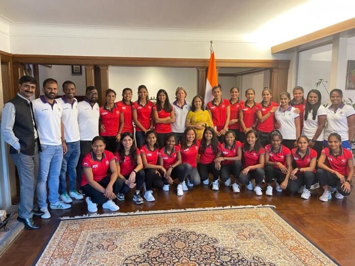 Indian Women’s Hockey Team was greeted at the Indian Embassy by Mrs. Reenat Sandhu, India’s Ambassador to the Kingdom of the Netherlands, yesterday and extended her wishes to the team India .