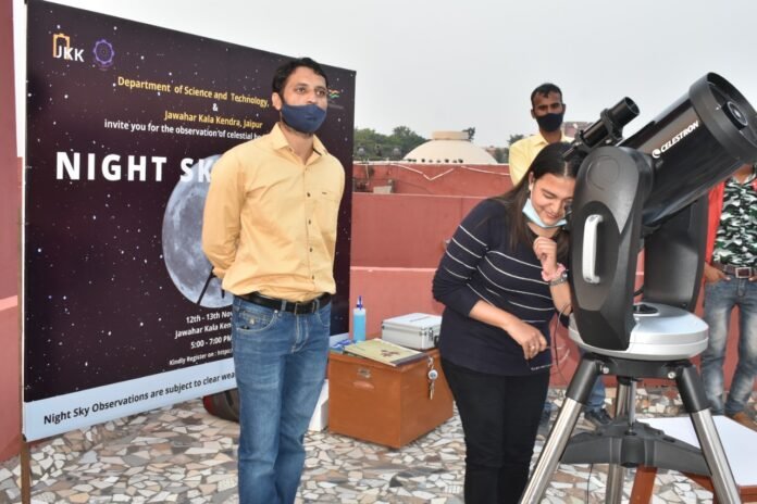 At an event organized by the Department of Science and Technology, Government of Rajasthan in association with Jawahar Kala Kendra (JKK), around 200 spectators observed the night sky through a high-powered telescope.