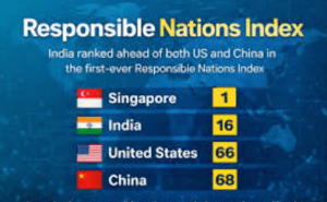 Singapore has emerged as the world’s most responsible nation, while India secured the 16th position in the newly released Responsible Nations’ Index (RNI), a global assessment that shifts focus from power and wealth to ethical and responsible governance. The index was formally launched in New Delhi by former President Ram Nath Kovind, marking the debut of a novel framework for evaluating national conduct.