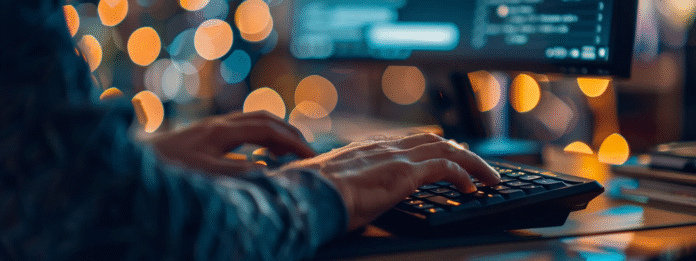 Alt text: A person’s hands on a computer keyboard making a query through an intelligent search tool