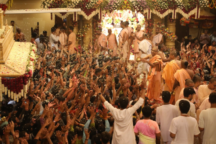The temple was lavishly decorated with lights and flowers, the deity was adorned with divine supernatural attire and flower bungalow. At 6 pm, the divine Mahaabhishek of the Lord was performed by the Vice President of the temple Anantashesh Das with Panchgavya, juice of various fruits and holy water from 108 urns. At the end of the festival, flowers were showered on the Lord during the palanquin festival and the devotees participated in the festival by chanting Hari Naam and dancing. At the end Prasad was distributed to all the devotees who came to the temple.